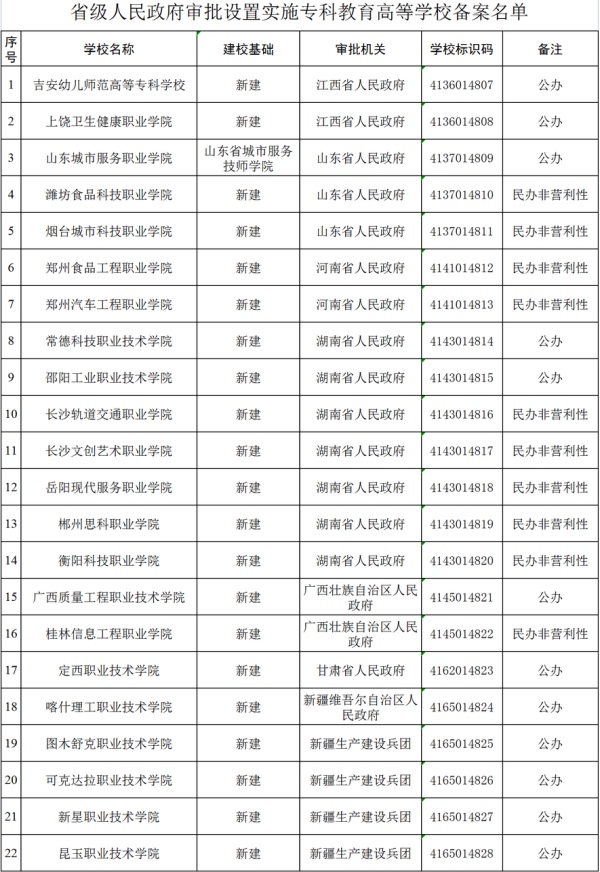根据《中华人民共和国高等教育法》《普通高等学校设置暂行条例》等有关法律法规和政策文件的规定,现将省级人民政府审批新设的专科层次高等学校备案名单予以公布。
